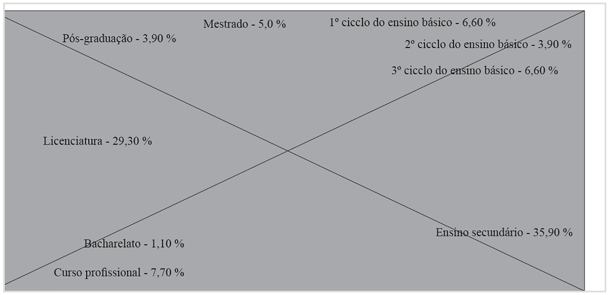 No que concerne às habilitações literárias, verificou-se que a maioria dos inquiridos apresenta o Ensino Secundário ou Licenciatura, correspondendo a 65 (35,90%) e 53 (29,30%) indivíduos, respetivamente. Por sua vez, o bacharelato foi a habilitação literária menos classificada com 1,10 %, seguida de pós-graduação e 2º ciclo do ensino básico, representando, cada uma, 3,90 % de respostas.