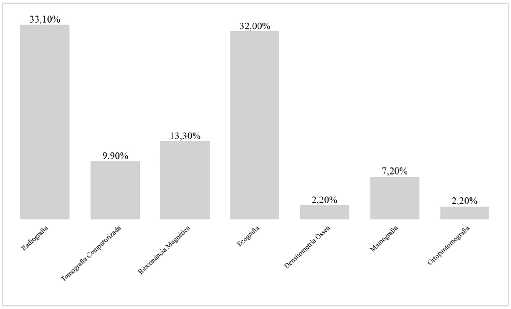 Quando questionados acerca dos exames imagiológicos realizados, foi possível verificar que 60 (33,10 %) indivíduos realizaram radiografia e 58 (32,0%) realizaram ecografia. Os exames que apresentaram uma menor frequência foram a Densitometria Óssea e a Ortopantomografia, ambas com 2,20 %.