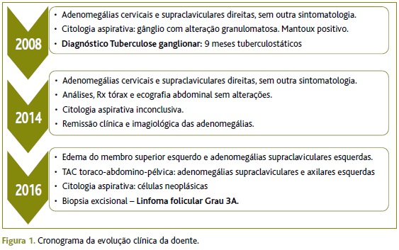Descrição do caso: Mulher de 69 anos, com antecedentes de tuberculose ganglionar em 2008, tratada com tuberculostáticos durante nove meses. Em 2014, na sequência de novas adenomegalias cervicais e supraclaviculares à direita, de características suspeitas, foi iniciada investigação, que foi inconclusiva dada a regressão espontânea do quadro. Dois anos depois recorre à consulta com adenomegalias supraclaviculares à esquerda, motivando nova investigação, nomeadamente com citologia aspirativa do gânglio, que mostrou a presença de células neoplásicas. Foi encaminhada para cirurgia geral para biópsia excisional do gânglio, cujo diagnóstico foi linfoma não-Hodgkin folicular. Iniciou quimioterapia no IPO com boa tolerância e resposta.