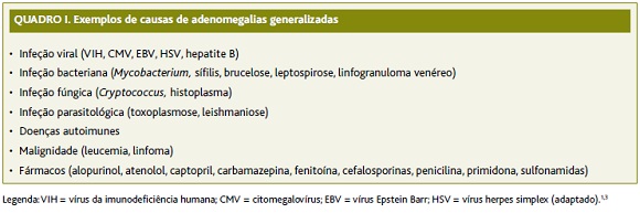 Na presença de um doente com adenomegalias, a história clínica e o exame objetivo têm uma importância primordial na orientação do diagnóstico. Se estivermos perante um quadro de adenomegalias generalizadas, a anamnese deve ser dirigida no sentido de procurar sintomatologia e fatores de risco associados a infeções virais, infeções bacterianas, infeções fúngicas, doenças autoimunes, doenças linfoproliferativas ou o uso de fármacos (Quadro I).1-2 Já na presença de adenomegalias localizadas podemos dirigir a anamnese e o exame objetivo a alterações relacionadas com os órgãos que drenam para as respetivas cadeias ganglionares, não esquecendo que as etiologias referidas anteriormente também se podem manifestar de forma localizada.2-3