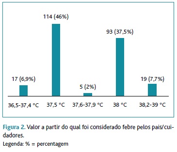 Resultados: Foram entrevistados 248 pais/cuidadores. Oitenta e três por cento fazem avaliação da temperatura na axila e 40% considera febre para valores inferiores a 37,5 °C. A maioria (54,7%) escolhe como principal fármaco a administrar o paracetamol e 30% sabe administrar doses corretas de medicação. As convulsões são consideradas a principal complicação associada à febre (62,1%). Cinquenta por cento recorre ao médico logo que surge febre ou no primeiro dia de doença, sendo o centro de saúde o local de eleição para a metade dos inquiridos.