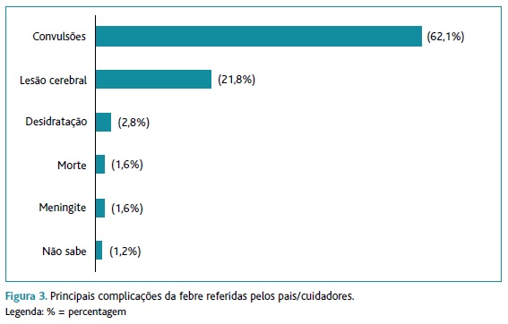 Sessenta e dois por cento referiram que as principais complicações da febre não tratada eram as convulsões e, em segundo lugar, a possibilidade de lesão cerebral (20%), sem conseguirem especificar qual o tipo de lesão. Apenas 2,8% considerou a possibilidade de desidratação (Figura 3).