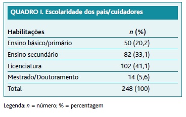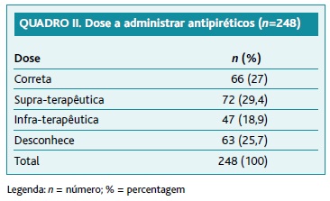 Aceitaram participar no estudo 248 pais/cuidadores dos 310 lactentes e crianças inscritos, os quais forneceram o seu consentimento informado. A taxa de participação foi de 80%. A idade dos pais variou entre 18 e 46 anos (média 32,8 anos) e a dos outros cuidadores entre 37 e 73 anos (média 60,5 anos). A mãe foi a principal inquirida (87,9%). Relativamente às habilitações, 41% era licenciado e 20% da população inquirida possuía o ensino básico. A distribuição do nível de escolaridade dos pais/cuidadores encontra-se representado no Quadro I. A média de idades das crianças avaliadas foi de 21 meses (1 mês - 35 meses). Relativamente à forma de avaliação da temperatura, a maioria (83%) escolheu a axila como local de avaliação (Figura 1). Quarenta e sete por cento consideraram existir febre se a temperatura fosse inferior a 37,5 °C, independentemente do local de avaliação e cerca de 7% referiu valores para febre entre 36,5 °C e 37,4 °C (Figura 2). Quase todos afirmaram ter no domicílio antipiréticos, sendo o fármaco mais utilizado o paracetamol (54,7%). No caso de possuírem paracetamol e ibuprofeno, o paracetamol foi o fármaco preferido para administração em primeiro lugar. Vinte e sete por cento sabiam administrar de forma correta a medicação (Quadro II). Dezasseis por cento admitiu não administrar medicação antes do recurso aos serviços de saúde, sendo o medo de mascarar os sintomas a principal razão apontada (74,4%). Os restantes afirmaram só administrar medicação após contacto com um médico (5,1%) ou não administravam por desconhecer a dose correta a administrar.