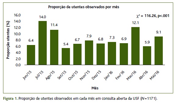 Resultados: Recolheram-se dados de 1171 CA (taxa de participação de 63%). A maioria dos utentes era do sexo feminino (62%), com 40-44 anos (9,5%; p<0,001) e isenta de taxa moderadora (57,9%; p<0,001). A maior afluência verificou-se em julho e agosto de 2015, e março de 2016 (p<0,001), à segunda-feira (23%) e às 9, 11, 14 e 15 horas (p<0,001). Foram considerados adequados 88% dos motivos de consulta.