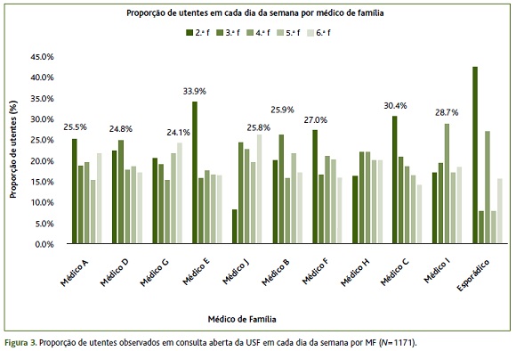 A Figura 3 apresenta a proporção relativa de utentes observados em cada dia da semana, de acordo com o seu MF. À segunda-feira, os utentes dos médicos E (33,9%), C (30,4%), F (27,0%) e A (25,2%) recorreram mais frequentemente à CA da USF. À terça-feira, os utentes dos médicos D (24,8%) e B (25,9%) registaram uma afluência maior. Os utentes do médico I afluíram com mais frequência à quarta-feira (28,7%). A sexta-feira foi o dia de maior afluência dos utentes dos médicos G (24,1%) e J (25,8 %).