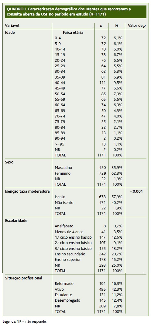 A caracterização demográfica da amostra está representada no Quadro I. Sessenta e dois por cento dos utentes que recorreram à CA da USF eram do sexo feminino, maioritariamente adultos (59,5%), pertencentes à faixa etária dos 40 a 44 anos (9,5%). Cerca de 36% dos utentes tinham como habilitações literárias o ensino secundário ou superior, encontrando-se 42,3% em situação profissional ativa. Mais de metade dos utentes (57,9%) estava isenta de taxa moderadora (p<0,001).