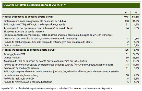 Aproximadamente 89% dos motivos de CA da USF foram considerados adequados, sendo o mais frequente «sintomas com início ou agravamento há menos de 15 dias» (91,7%). Cerca de 11% dos utentes recorreram à CA da USF por motivos considerados inadequados, sendo os mais frequentes «prorrogação de CITT» (24,6%) e «outros motivos» (23,8%), que são maioritariamente sintomas com duração superior a 14 dias (Quadro II).