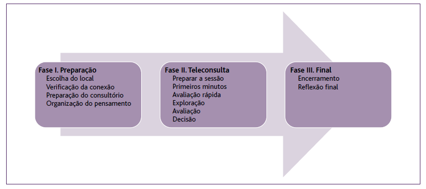 Fase I. Preparação: escolha do local, verificação da conexão, preparação do consultório e organização do pensamento. Nesta fase revê-se o estado do consultório e a história do utente, preferencialmente no dia anterior, para se solucionar atempadamente algum problema técnico identificado.