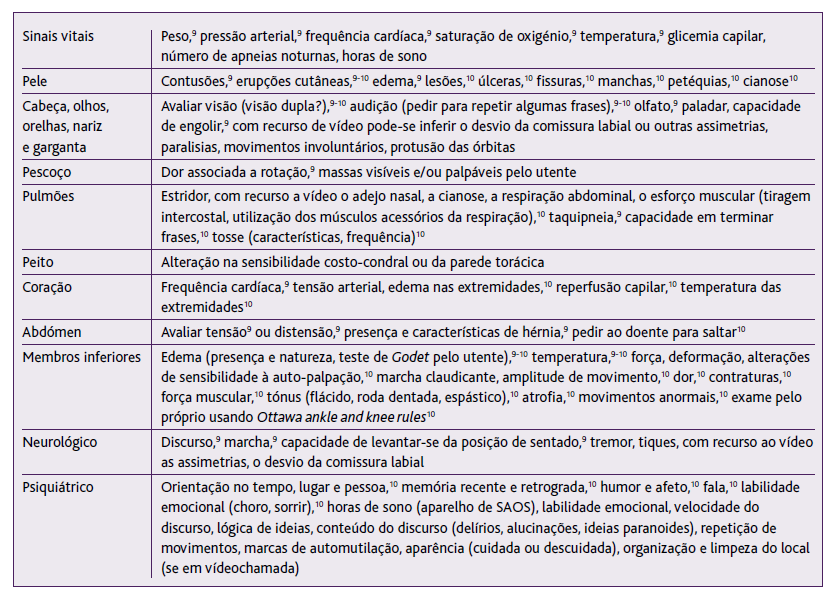 Avaliação dos sinais vitais. O doente poderá ter dispositivos médicos que facultem estes dados - temperatura, pressão arterial, frequência cardíaca e respiratória e dor. Com a pandemia, alguns doentes adquiriram oxímetro e também a saturação periférica de oxigénio pode ser facultada.