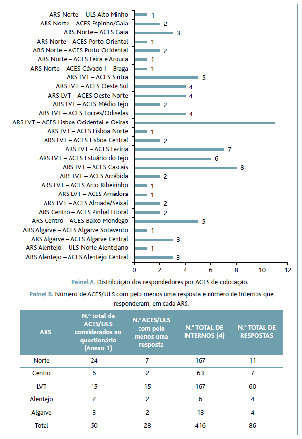 Obtiveram-se apenas 86 respostas de um total de 416 internos, 60 das quais pertencem a internos da ARS LVT. Ambos os valores podem contribuir para um enviesamento dos resultados alcançados. A baixa taxa de resposta poderá estar relacionada com a inexistência de SAR em vários ACeS/ULS, condicionando uma reduzida participação nesses locais e um predomínio das respostas da ARS LVT, onde catorze dos quinze ACeS têm esta prática implementada.