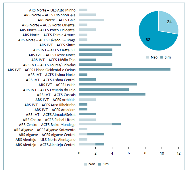 À questão No seu ACeS realizam-se SAR? obtiveram-se 62 respostas afirmativas (72,1%). Do total de internos pertencentes à ARS Norte que responderam ao questionário todos negaram a realização de SAR. Na ARS LVT todos afirmaram a realização destas sessões, exceto o ACeS Arrábida. Já nas ARS Centro, Alentejo e Algarve, as respostas não foram uniformes, existindo ACeS/ULS que realizavam SAR, contrastando com outros na mesma região que não o faziam. Verificou-se ainda que, dentro de alguns ACeS/ULS destas regiões, as respostas diferiam entre colegas, podendo existir no mesmo ACeS grupos de aprendizagem relacional que não incluíam todos os elementos de um mesmo ano (Figura 2).