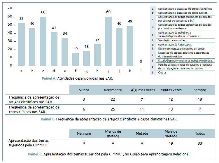 O guião para aprendizagem relacional proposto pela CIMMGF LVT propõe que algumas destas atividades sejam feitas de forma regular, nomeadamente a apresentação de artigos científicos, casos clínicos e temas ajustados aos objetivos de cada estágio. Relativamente à frequência destas atividades, dos 62 internos que afirmaram realizar SAR 12 referiram que a apresentação de artigos científicos ocorre «muitas vezes» e 18 indicaram que acontece «sempre»; relativamente à apresentação de casos clínicos, 13 internos referiram que ocorre «muitas vezes» e apenas sete indicaram que acontece «sempre» (Figura 3, painel B). Quanto à apresentação dos temas sugeridos pela CIMMGF LVT mais de metade indicou que todos os temas foram apresentados (Figura 3, painel C).