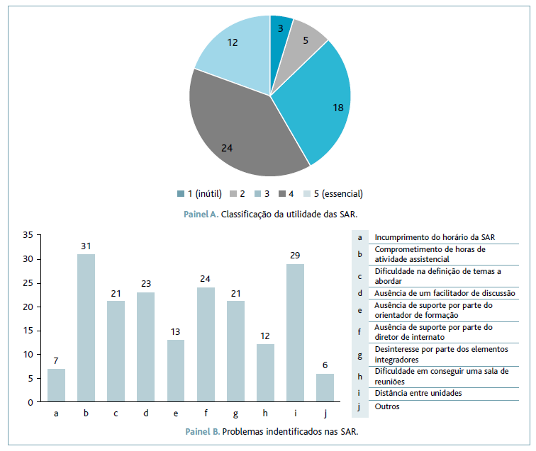Quanto aos problemas identificados, metade dos 62 internos que afirmou realizar SAR assinalou o «comprometimento de horas de atividade assistencial», 29 selecionaram a «distância entre unidades» e 24 destacaram a «ausência de suporte por parte do diretor de internato» (Figura 4, painel B).