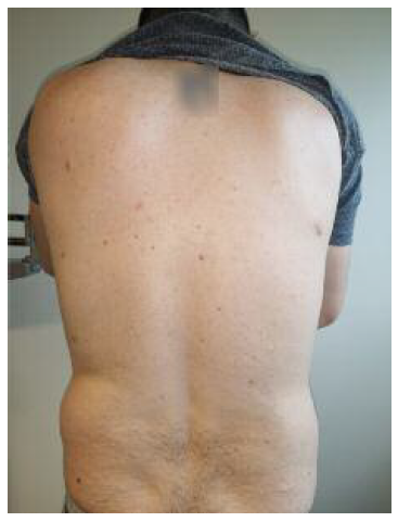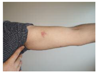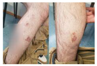 Em 09/06/2020 é realizada consulta presencial com o seu MF por agravamento das lesões. Ao exame objetivo apresenta placas de cor violácea, duras ao toque, não dolorosas, mais exuberantes nos membros inferiores (Figura 1) mas também dispersas pelos membros superiores (Figura 2) e tronco (Figura 3). É novamente referenciado para o SU para observação por dermatologia, tendo realizado biópsia, que revelou SK e presença do HHV-8.