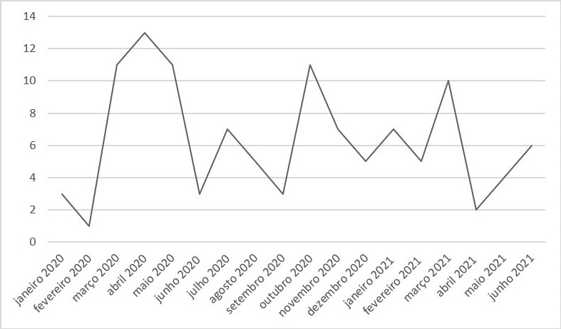 Perante a pandemia, a atividade da associação passou a acontecer maioritariamente online, tendo sido reativados canais de comunicação que já tinham existido, e foram desenvolvidas novas estratégias e iniciativas para poderem dar continuidade ao trabalho que constitui a sua missão: a representação das pessoas mais velhas junto do poder político e a reivindicação dos seus direitos. Na página pública de Facebook, que tem aproximadamente 5500 seguidores, foram realizadas 114 publicações durante o período analisado no âmbito deste estudo (janeiro de 2020 a junho de 2021, ver Figura 1).