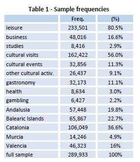 We start by reviewing the profile of general tourists in the region, further focusing on the main characteristics of tourists of cultural activities. Our data sample comes from the Tourism Expenditure Survey (EGATUR) of the Spanish Institute of Tourism Studies (IET). After depuration, the sample comprises around 290,000 questionnaires characterising foreign tourists visiting the Spanish Mediterranean coast (including regions (NUTS 2) of Catalonia, Valencia, Murcia, Andalusia and Balearic Islands) during the period 2004-2009. This geographical area is the most important destination in Spain, and one of the leading places in Europe, accounting for more than 65% of international arrivals to the country, what represents around 40 million of tourists per year. The questionnaire developed by IET provides information on socio-demographic profile of visitors (gender, age, studies, income level, etc.), features of the trip (length of stay, accommodation, activities developed during the stay), and the behaviour of tourists regarding some key variables (overall trip satisfaction, expenditure patterns, and stay duration). It also includes a question on the purpose of the visit, either for leisure, business, or studies.