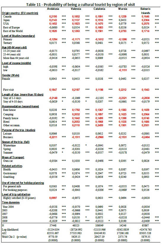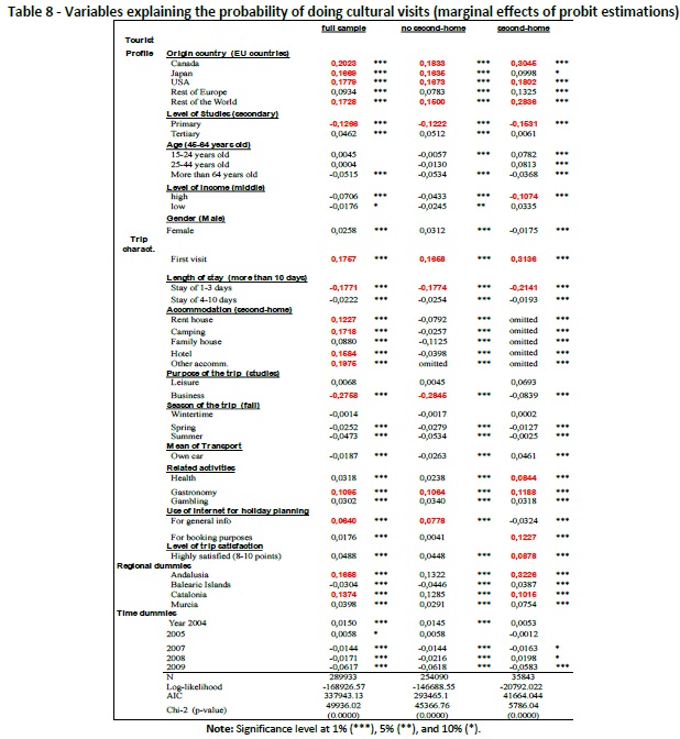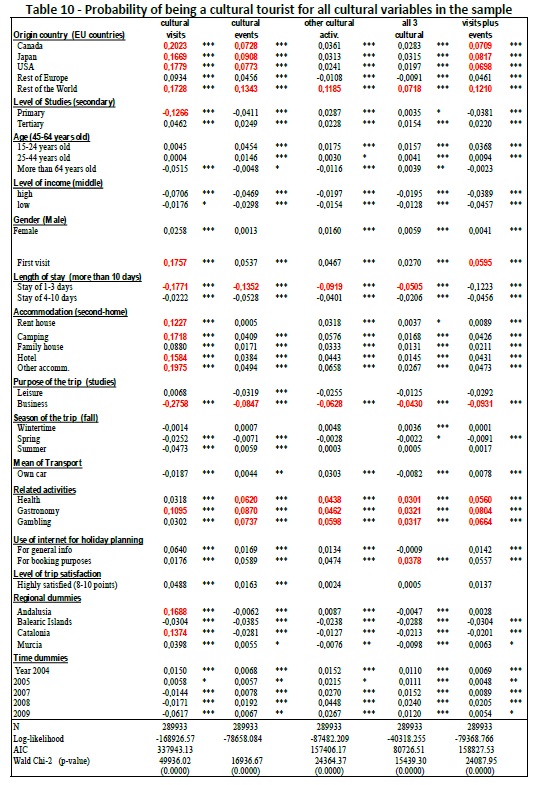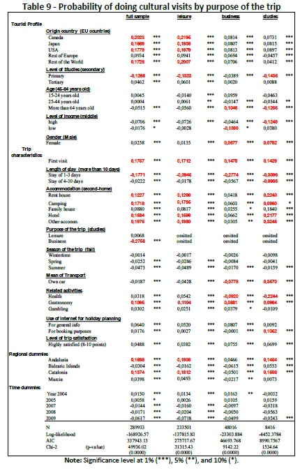 In order to enrich our knowledge on the issue we have applied probit models to our data set, running the analysis for a number of segments of the sample, including those of the purpose of the visit (leisure, business, studies), the property or not of a second-home at the destination, the type of cultural consumption carried out (cultural visits, events, or other type of cultural activities), and the region of the visit. General results have shown the leading role that these types of cultural activities play in attracting extra-EU visitors, as well as new (first-comers) to this area. Cultural tourists also show higher probability of staying for a longer time at destination, being mainly engaged into leisure and studies trips. Gastronomy activities, defined by some authors as another type of culture- related activity, clearly appear as a natural complement of cultural activities. The use of Internet when planning the trip is also an important resource of visitors pursuing cultural activities. Andalusia and Catalonia appear as the most visited cultural destinations of the Spanish Mediterranean area, given the big supply of heritage, local culture, and urban-related assets that these regions offer. Other relevant results include the positive relationship arising between the level of education of visitors and their engagement with cultural trips, and the lower presence in cultural tourism of visitors having a second- home at destination.