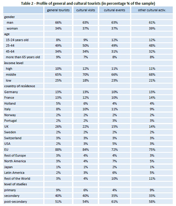 Section 3 estimates and discusses the results of probit models explaining the factors surrounding several types of cultural tourists, namely tourists doing cultural visits, those attending to cultural events, and the ones coming in search of other type of cultural activities. Section 4 concludes and provides some guidelines on destination management emerging from the investigation.
