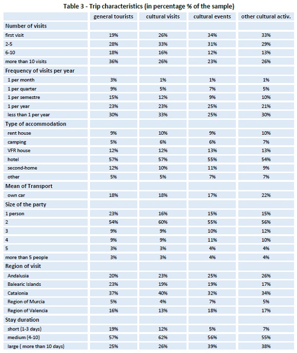 destinations we have seen that visitors coming for cultural activities spend more in average than general visitors, stay for longer time, and show higher levels of overall trip satisfaction. They also attract a higher relative number of new visitors from extra-EU countries, of first-time visitors, and of those with higher sensitivity linked to higher levels of studies, in comparison with the general tourists visiting this area. All these features identified in the culturally engaged international visitors would be willing to provide a richer environment for indigenous residents, reducing in this way the typical damaging impact of mass tourism on local population. Results also suggest that promoting and developing cultural tourism is a desirable policy, resulting in a growing number of visitors, and a corresponding positive impact at destinations, either economic, social or cultural. The importance of the promotion of cultural tourism at the level of destination has become clear along the investigation. Catalonia is undoubtedly one destination highly investing in the promotion and development of cultural tourism in the last two decades. Andalusia has also allocated important resources in these types of activities, valuating the cultural heritage and investing in the promotion of their intangible cultural traditions as i.e. enjoying the street life. The success of these policies has been shown by data, with these two regions appearing as the preferred destinations of cultural visitors in the Spanish Mediterranean area. The growing role of the Internet for promotion policies for cultural visitors has also been pointed out by results in the paper. Other opportunities of attracting new arrivals seems to arise for business visitors and shorter-stayers as interesting targets for the future. Gastronomy also appears as an important factor of attraction for new visitors with an important level of complementarity with cultural supplies in the development of the tourism sector.