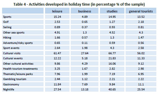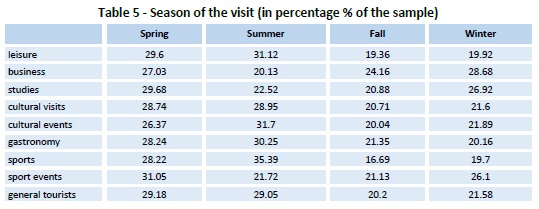 The preferred season of the visit is the summertime for leisure purposes, but in spring and wintertime for business and studies´ trips. Cultural visits and events mainly take place in spring and summertime, as well as gastronomic and sport activities, mostly in line with the general tourists (Table 5).