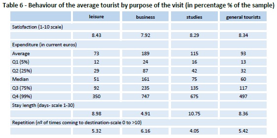 Regarding the behaviour of the average tourists in table 6, overall trip satisfaction is shown to be higher for leisure tourists, although both groups of students and business visitors show high values in the overall satisfaction scale of around 8 out of 10. The distribution of expenditure shows higher average levels of spending for business tourists, followed by students, and leisure ones. For the average tourist, the ratio is of 2.6 between the business and the leisure´s daily spending, and of 1.6 between the studies and leisure´s tourists one. For the median tourist these ratios account for 3.13 and 1.47, respectively, while in the upper tail (Q4 case) they account for 2.13 and 1.92, respectively. Daily expenditure is shown to be up to 747 for business visitors, 675 for students while in vacation, and 350 for leisure trips. Duration of stay is remarkably lower for business trips, with 4.91 days on average, nearly double, around 9 days, for leisure tourists, and 10.75 days in average for students. Business visitors are the highest repeaters in the sample, followed by leisure and studies´ travellers, respectively.