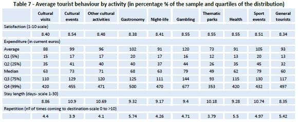 The behaviour of the tourist by holiday activity in table 7 shows that the level of trip satisfaction is higher for those engaged with cultural events, gambling, thematic parks, and health activities, although the rest of activities show higher satisfaction level of tourists in general, all above 8 in a 10-point scale. In any case all selected activities overcome the full sample level of declared satisfaction that stays at 8.34 points. The distribution of spending of tourists shows higher levels in the case of gastronomy, gambling, and sport events, followed by cultural events, and other cultural activities. In the Q4 (fourth quartile) case, gambling, gastronomy, and cultural activities show levels of daily spending that range between 677 and 420 euros. Duration of stay I shown to be the highest in the case of cultural events and activities, sport events, and thematic parks, and the lowest for cultural visits. However, all these stays range between 8.8 and 10.9 days. The highest repeaters can be found on tourists engaged with gastronomy and health activities, while the lowest are among those coming to visit a thematic park and cultural events.
