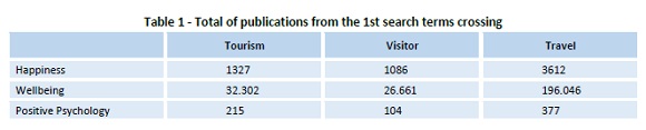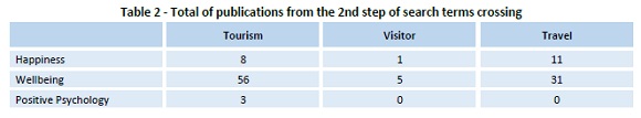 3. Results and discussionA total of 261.730 references were found in the first step of the search (Table 1). Through the application of the inclusion criteria a) and b) this number decreased to 115 publications (Table 2). Since in this step restrictions more aligned with our study goal were applied, it revealed, in our understanding, a closer look to the publications being developed in the confluence between (Positive) Psychology and Tourism.