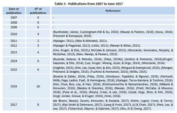 Key topics and publications conclusions were observed carefully. In a first overview, we could see (Table 3) that from 2007 until 2009 we did not find publications that comply with the chosen criteria. The first references come in 2010 and are scarce until 2015. In 2016 the references double when compared with 2015, and in 2017 (at the date of this research) we already had a number of references that lead us to believe that a similar number of references from 2016 may be, eventually, achieved at the end of this year. This result may reflect that applying Positive Psychology to the Tourism settings is rather new and in the process of interesting more researchers to its potential. This is in accordance with Zhang (2013), who acknowledges that studies that link tourism and wellbeing are not the norm.