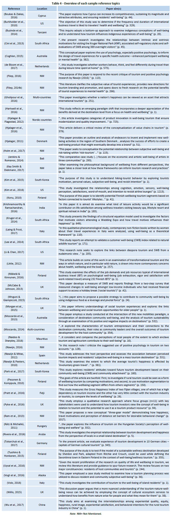 In Table 4 the location where the study was conducted is identified and/or where the participants were from. The overall aim of each publication is also stated. The majority of studies are being developed in Europe with particular emphasis in the Nordic countries (Hjalager, 2011; Hjalager & Flagestad, 2012; Konu, 2010; Mäkelä & Kinnunen, 2016; Pesonen & Komppula, 2010; Tuohino & Honkanen, 2015) and the UK (McCabe & Johnson, 2013; Morgan et al., 2015; Pyke et al., 2016; Willis, 2015). Furthermore, a dispersion of the remaining publications is observable in Europe through different countries such as Netherlands (de Bloom et al., 2017; Nawijn & Peeters, 2010); Hungary (Rátz & Michalkó, 2011), Spain (Nawijn & Mitas, 2012), Italy (Laing & Frost, 2017; Volo, 2016), Germany (Tokarchuk et al., 2017) and Cyprus (Boukas & Ziakas, 2016). It is interesting to note that the Nordic countries are in the lead. It is well known that these countries are known to be the “happiest” ones’. Nordic countries have in common a high appreciation for equality, inclusion, and care of their people (Jackson, 2017), which means that they already go beyond the fulfillment of basic needs with higher aims. According to Zhang (2013), when our basic needs are satisfied we tend to search for the next step and improve our quality of life, and tourism is a form to better our life (Filep & Pearce, 2014).