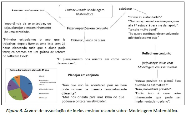 Nesse tocante, a construção da árvore de associação de ideias (Figura 5) deu visibilidade à ação desenvolver em conjunto que foi norteada por ações secundárias relativas às etapas de uma atividade de modelagem, tais como experimentar, relacionar, modelar. Ao assumir o papel de modeladoras no desenvolvimento da atividade, as professoras se depararam com a necessidade de revisitar conceitos e procedimentos, além de se posicionar na defesa de suas concepções e de se abrir para a compreensão de novas ideias.