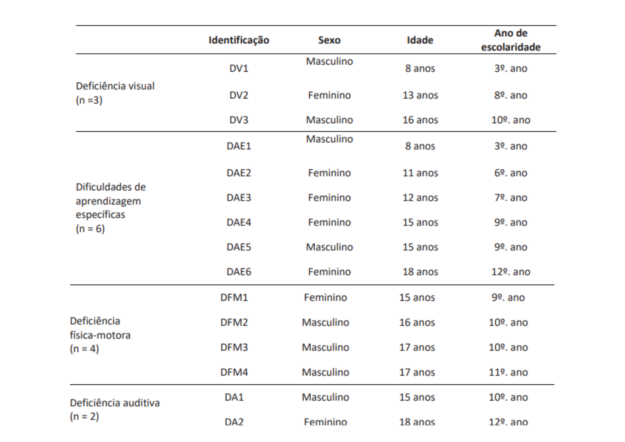Fonte: Autores. DV = deficiência visual; DAE = dificuldade de aprendizagem específica; DFM = deficiência físico-motoras, DA = deficiência auditiva