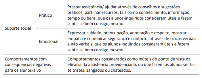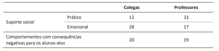 Os alunos identificaram uma diversidade de formas de suporte social nos professores e nos seus colegas, tendo, de uma maneira geral, referido mais comportamentos e interações com consequências positivas do que com consequências negativas, quer da parte dos colegas (respetivamente, 40 e 20 referências), quer da parte dos professores (respetivamente, 40 e 19 referências). No entanto, é de referir que os participantes tendem a referir mais vezes o suporte emocional dado pelos seus colegas (28 referências) do que pelos professores (17 referências) e mais vezes o suporte prático dado pelos seus professores do que pelos seus colegas (respetivamente, 23 e 12 referências) (Tabela 3).