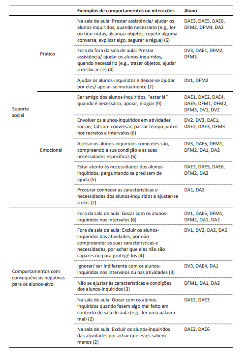 Todas as entrevistas foram integralmente transcritas e, também, traduzidas para inglês. O trabalho de análise foi realizado conjuntamente pela primeira autora do artigo e dois outros parceiros do projeto, que discutiram e resolveram por consenso as ambiguidades encontradas e as afirmações mais difíceis de classificar. Para este artigo, todos os exemplos de suporte social negativo foram agrupados numa única categoria denominada comportamentos com consequências negativas para os alunos-alvo.