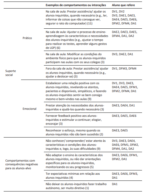 A par de formas específicas de ajudar, dois alunos identificaram, também, como forma de suporte prático muito importante, a reciprocidade e cooperação com os colegas (Tabela 4). Como explicou um aluno, “Eu gosto quando tenho a oportunidade de ajudar os meus colegas em disciplinas nas quais eu sou bom (como, Inglês e Português)” (DFM2). No que diz respeito aos professores, os participantes também identificaram como forma de suporte social prático ajustar o processo de ensino-aprendizagem às suas características e necessidades, tais como diversificar estratégias, usar elementos visuais, ajustar a avaliação, e também modificar as condições do meio físico de forma a que consigam participar nas atividades (DV3, DAE2, DA1) (Tabela 5).