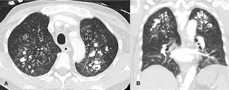 Figure 2: (A) Axial and (B) Coronal chest CT scan showing multiple ground-glass opacities associated with poorly defined centrilobular nodules with coarse areas of calcification, with a symmetrical distribution involving both upper lung lobes.
