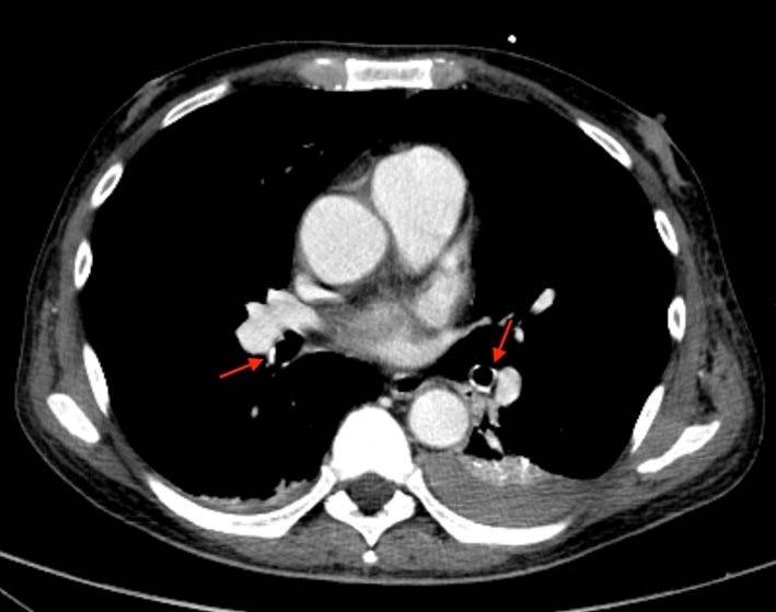 Chest radiographic findings are variable and non-specific for MPC diagnosis. Due to the low sensibility to depict small amount of calcification, chest radiograph is usually normal. A pattern of confluent and patchy airspace opacities simulating infection or pulmonary edema may responsible for 20-30% of the cases.6 Other malignant causes that can lead to this condition are leukemia, parathyroid carcinoma, lymphoma, breast cancer and malignant melanoma.7,8,9 In our case, there were several factors predisposing to MPC including hypercalcemia, hyperparathyroidism, and chronic kidney failure with a history of hemodialysis.