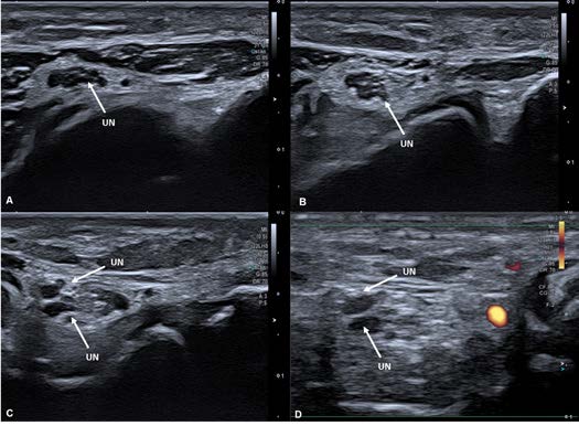Figure 1: Right Elbow Ultrasono- graphy Transverse Cut: Ulnar nerve at different levels of its course going distal to proximal (1A to 1D). It starts with its usual unique configuration (1A and 1B) and then starts to split (1C). Through Fig. 1D it is possible to distinguish the ulnar nerve (without Power Doppler signal) from blood vessels (with Power Doppler signal).