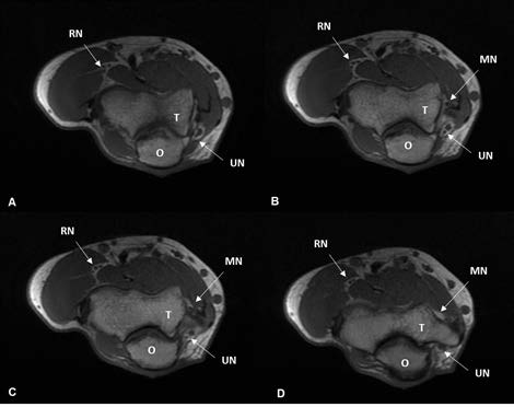Figure 2: Right Elbow MRI T1 Wei- ghted Axial Cut: ulnar nerve at different levels, going from distal to proximal (2A to 2D). It is possible to observe the bi- partite ulnar nerve in a small portion of its path (2B and 2C) and then it returns to its unique configuration (2D). Abbreviations: MN - Median Nerve, O - Olecranon process, RN - Radial Nerve, T - Trochlea, UN - Ulnar Nerve.