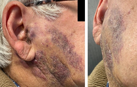 Figure 1: Right parotid region swelling associated with irregular violaceous skin plaques, extending anteriorly to the masseteric region, and posteriorly to the retroauricular region.