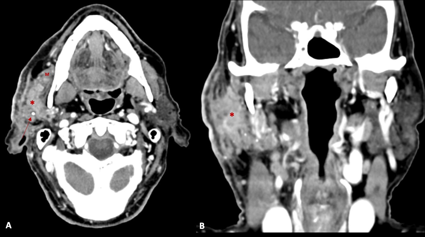 Figure 2: Contrast enhanced axial (A) and coronal (B) CT images, demonstrating an infiltrative mass (*) in the right parotid gland (in both superficial and deep lobes), that infiltrates the surrounding fat planes and skin, and invades the right masseter muscle (M). Some calcifications (arrow) are also present.