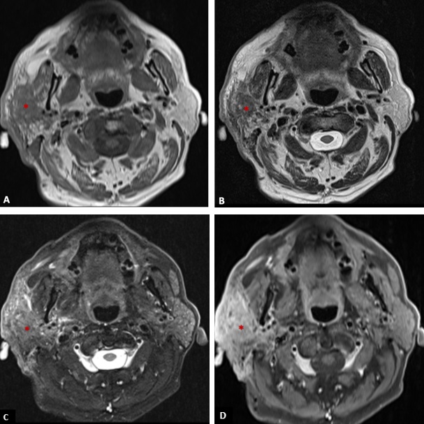 Figure 3: T1-weighted axial image (A), T2-weighted axial image (B), fat suppressed T2-weighted axial (C), and post-contrast fat suppressed T1-weighted axial image (D) showing an infiltrative mass (*) in the right parotid gland with low signal on T1, heterogeneous signal on T2 (with areas of high and low signal), and heterogeneous enhancement invading the adjacent fat, skin and the right masseter muscle.