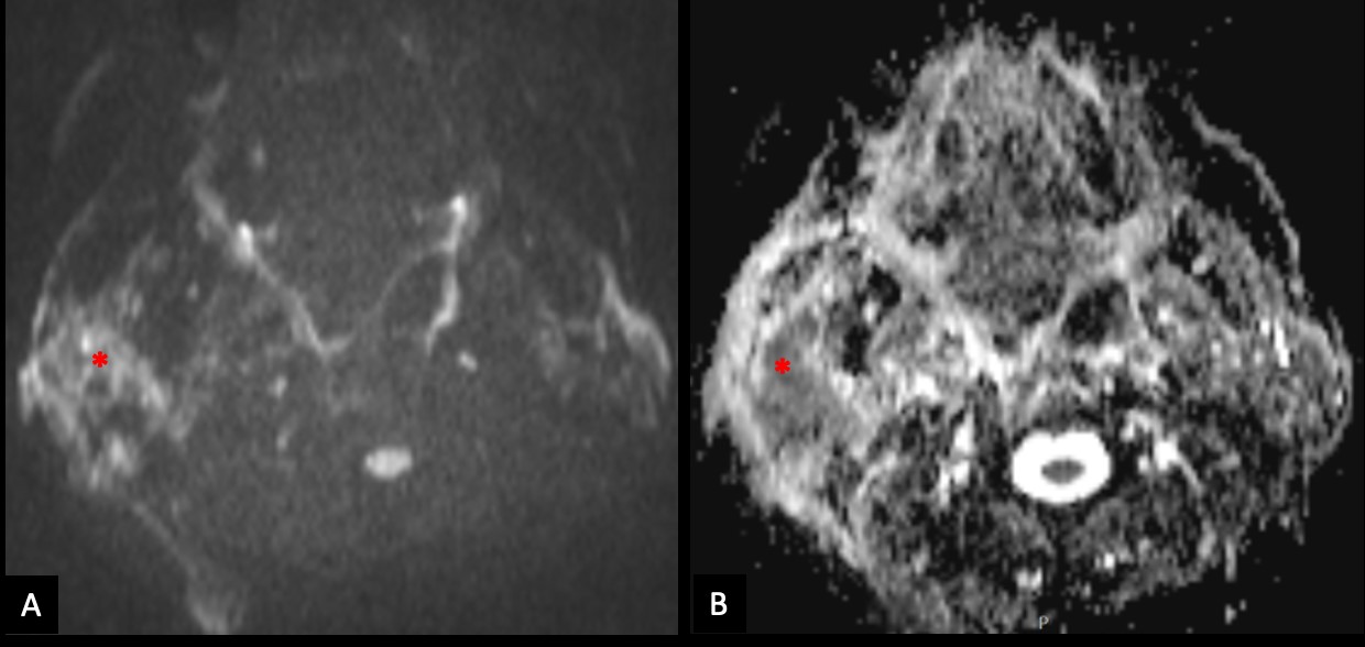 Figure 4: The right parotid lesion shows moderate restricted diffusion (*), with high signal on diffusion-weighted image with b value of 800s/mm2 (A) and low signal on apparent diffusion coefficient map (B).