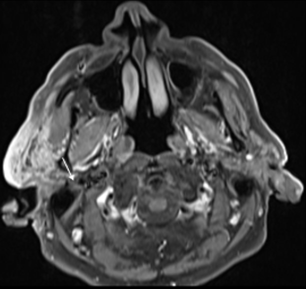 The lesion also revealed restricted diffusion, with an ADC value of 0,858 x 10-3 mm2/s (Fig. 4). Additionally, a more focal nodular and irregular area was evident in the superficial parotid lobe. There was also a noticeable infiltration of the adjacent fat planes and skin, invasion of the right masseter muscle, and extension of the lesion to the submandibular space without the involvement of the right submandibular gland (both submandibular glands were atrophic). The right facial nerve showed a moderate high signal on T2-weighted images and post-contrast hyperenhancement that was perceptible in its path up to the stylomastoid foramen, which was a cause of concern regarding perineural spread (Fig. 5). Retromandibular vein thrombosis was visible. An increased number of lymph nodes was present in all right cervical levels, the largest node measuring 11 mm (in greater diameter), some of them showing round morphology and central areas of necrosis. There were no signs of mandibular invasion or other suspicious bone lesions. CT also excluded signs of lung metastases. Ultrasound-guided fine needle aspiration of the right parotid lesion was performed, demonstrating involvement of the parotid parenchyma by a malignant tumor with a nest pattern constituted by epithelioid cells with eosinophilic cytoplasm and atypical nuclei, with evident nucleolus and frequent mitoses. Comedonecrosis-type tumor necrosis areas, as well as lymphatic and vascular invasion were observed. The findings were compatible with a salivary duct carcinoma (SDC), with expression of androgen receptors. The management options were discussed in a multidisciplinary group meeting and with the patient. Due to the extension of the neoplastic lesion and the potential morbidity associated with the surgical procedure that would preclude a complete resection, radiotherapy and antiandrogen therapy were chosen.
