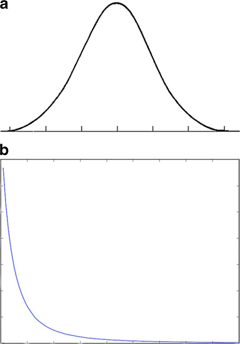 Figura 1: Se assumirmos que a acuidade radiodiagnóstica tem uma distribuição gaussiana (a), então cerca de metade desse desempenho deve estar abaixo da média. O desempenho individual pode antes seguir uma distribuição paretiana (b), em que mais desempenho é agrupado no lado esquerdo da curva exponencial reversa, onde a maioria dos feitos foram alcançadas por um pequeno número de super-performers; neste modelo, a maioria dos executantes estão abaixo da média e, portanto, serão menos produtivos ou mais propensos a cometer erros do que os super-performers; a mediana desta distribuição também está desviada para o extremo alto do desempenho. Em Radiologia, é transversal a todas as práticas e modalidades, que a acuidade diagnóstica entre diferentes observadores muito raramente atinge os 100,0%, década após década, qualquer que seja a nacionalidade ou ambiente, académico ou não, quer em estudos publicados ou não em jornais científicos, e indexados ou não. [Figura retirada da referência 2 - Open Access: Creative Commons Attribution 4.0 International License (https://creativecommons.org/licenses/by/4.0/)]