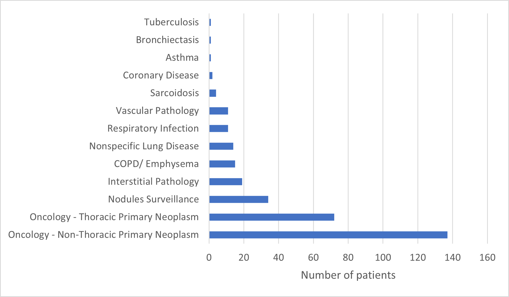 The study encompassed 350 patients, with a median age of 65 years, ranging from 24 to 96 years. Of these patients, 199 (56.9%) were male, while 151 were female. Clinical contexts are given in Figure 2, with oncology leading the speciality for Chest CT performance.