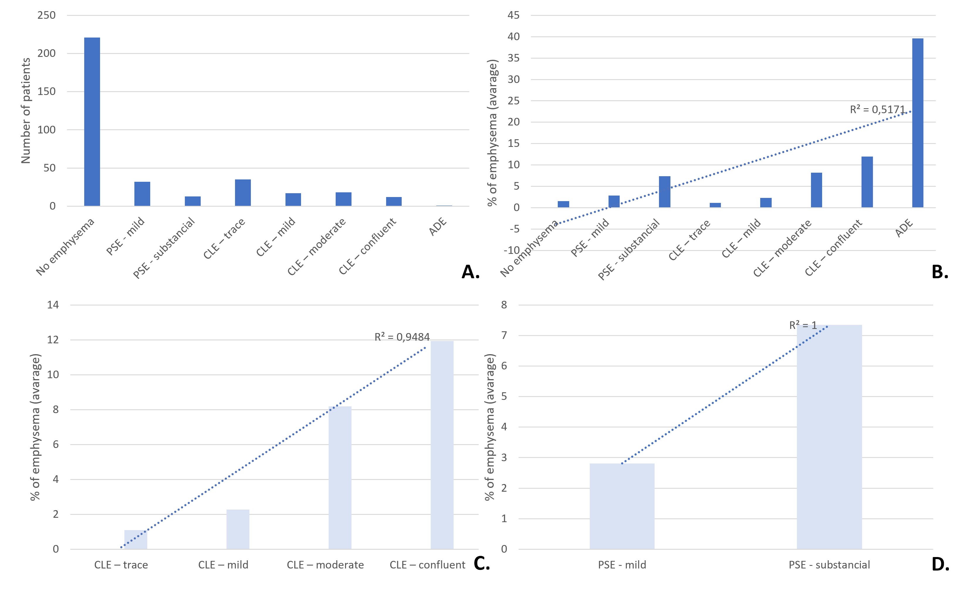 Figure 3: Emphysema type. A. Number of patients classified by the Expert Panel (qualitative classification) with each type of emphysema. B, C and D. Expert Panel’s classification with the corresponding percentage of emphysema on AIRC-cCT. PSE - paraseptal emphysema, CLE - centrilobular emphysema, ADE - advanced destructive emphysema.