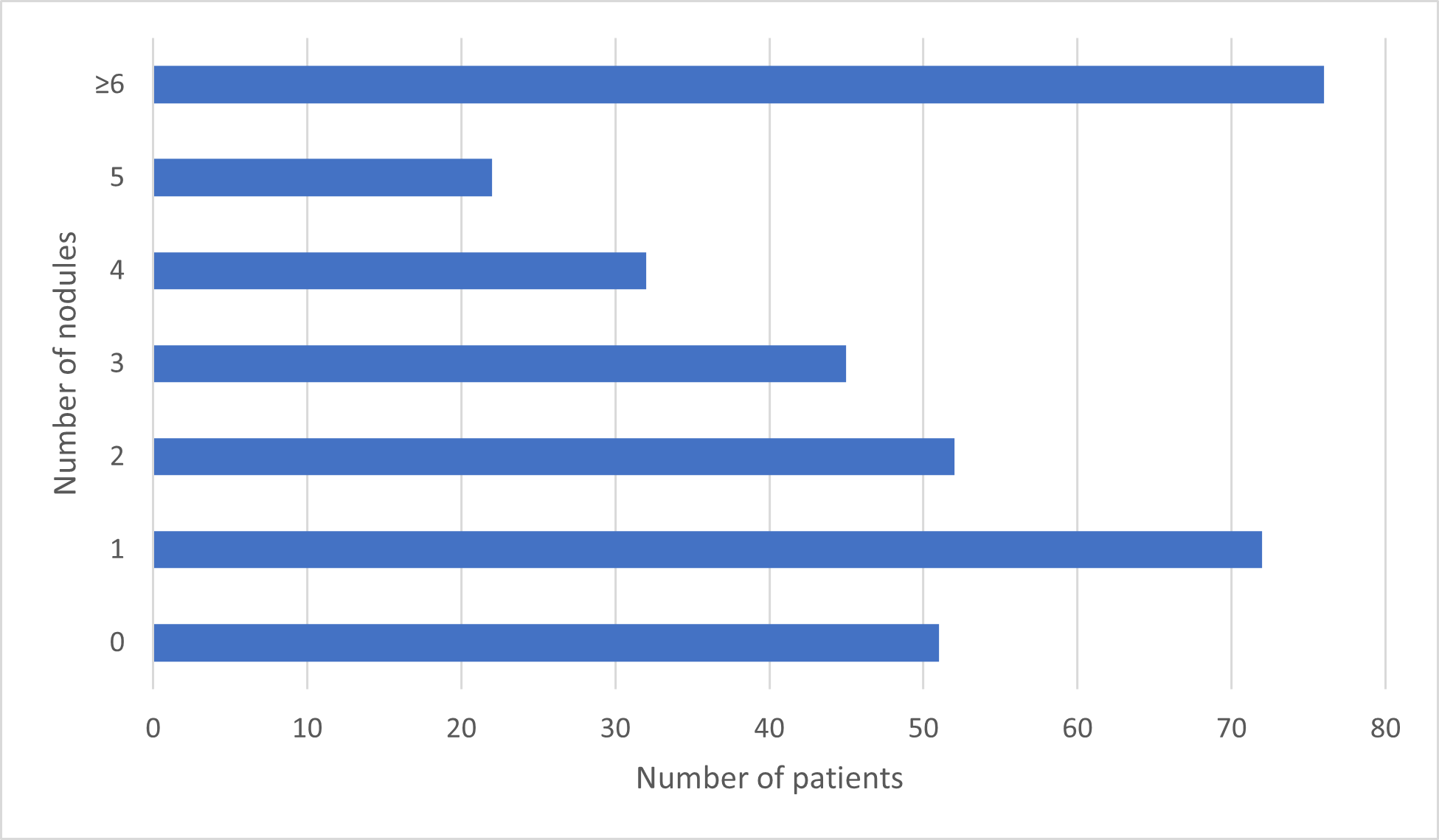 The Expert Panel regarded 677 (67.5%) real nodules, with a PPV of 46.7%. Out of those, 468 were clinically relevant: 452 solid nodules, 9 subsolid nodules, 4 ground-glass opacities and 3 hamartomas. 209 nodules (20.8%) were considered non-relevant (Table 2).