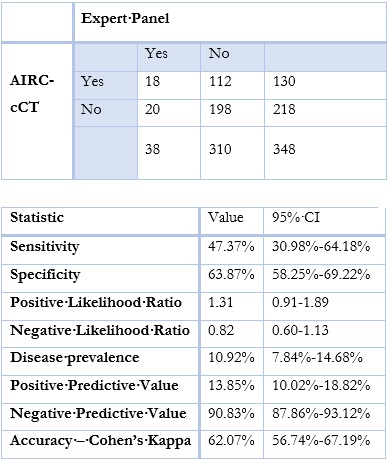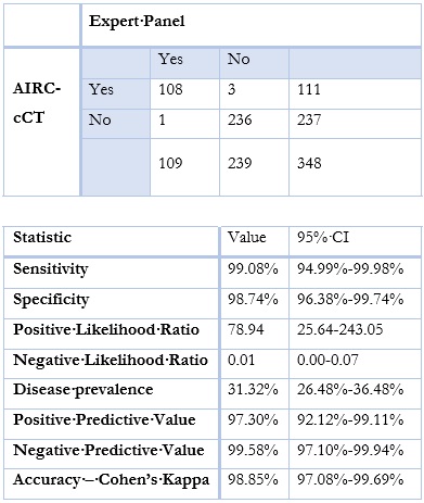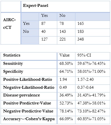 When trying to assess AIRC-cCT’s performance against the Expert Panel, sensitivity was 68.5, specificity was 64.7%, PPV was 52.7%, NPV was 78.1%, Cohen’s kappa was 66.1% (p<0,0001)(Table 1).