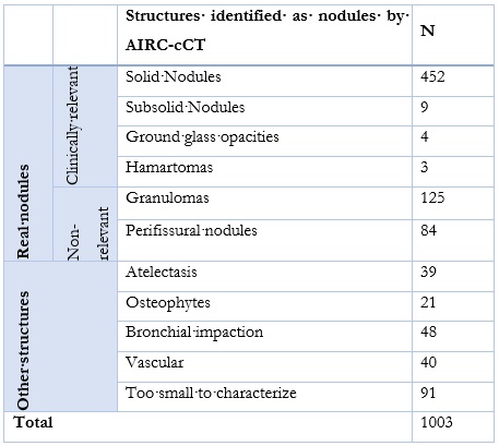 AIRC-cCT identified 1003 nodules, revealing a moderate capacity to detect real nodules, according to Expert Panel (67.5% were real nodules) and a moderate PPV (46.7%). Since we do not have a low prevalence of nodules in our population, low PPV is not dependent on the sample size. Chances that a positively screened nodule by AIRC-cCT is a relevant nodule are below <50%.