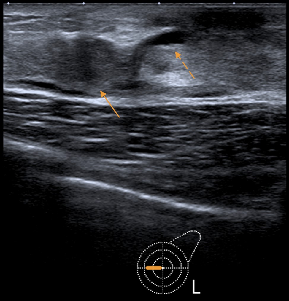 Figure 1: Breast ultrasound revealed a 9 mm hypoechoic, solid nodule (solid arrow), associated with slight duct ectasia (dashed arrow).